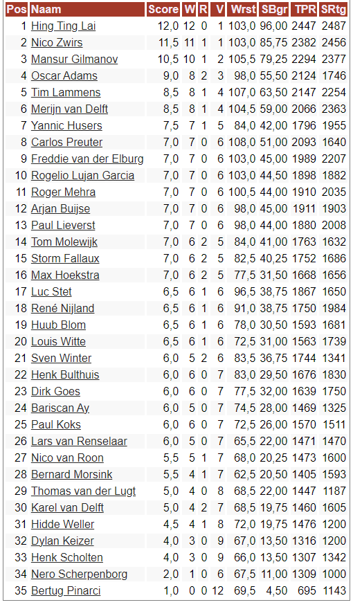 In de voorlaatste ronde speel ik een belangrijke rol in de strijd van ratingprijs tot 1500. Mijn tegenstander Lars van Renselaar en ikzelf staan op 5 punten. Zijn concurrent in de ratingprijs op 5½ punten. Hij vertelt me: “dus ik moet nu alles winnen”. Waarop ik reageer met: “en ik ben er om dat optimaal tegen te werken.” Op dat moment moest hij er om lachen. Voor mij was het een verrassend gemakkelijke pot. Hoe hij alles weggaf. Hij was duidelijk niet met de stelling bezig. Ik heb ook meermaals ratingprijzen gewonnen. Maar dat weet ik dan pas bij de prijsuitreiking. Onderweg tijdens het toernooi ben ik daar totaal niet mee bezig. Maar ik ga natuurlijk niet protesteren tegen zijn partijbehandeling.